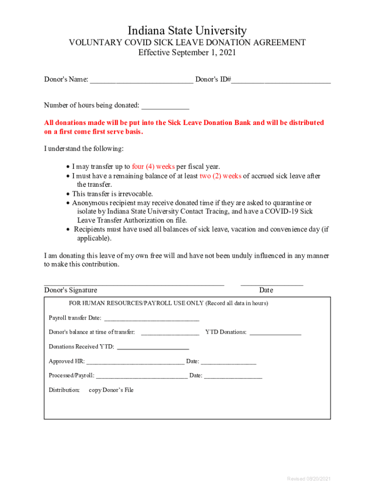 Indiana State UniversityVOLUNTARY COVID-19 SICK LEAVE DONATION AGREEMENT Effective September 1, 2021, Donor\'s Name: ___ Donor\'s ID#___ Number of hours being donated: ___ All donations made will