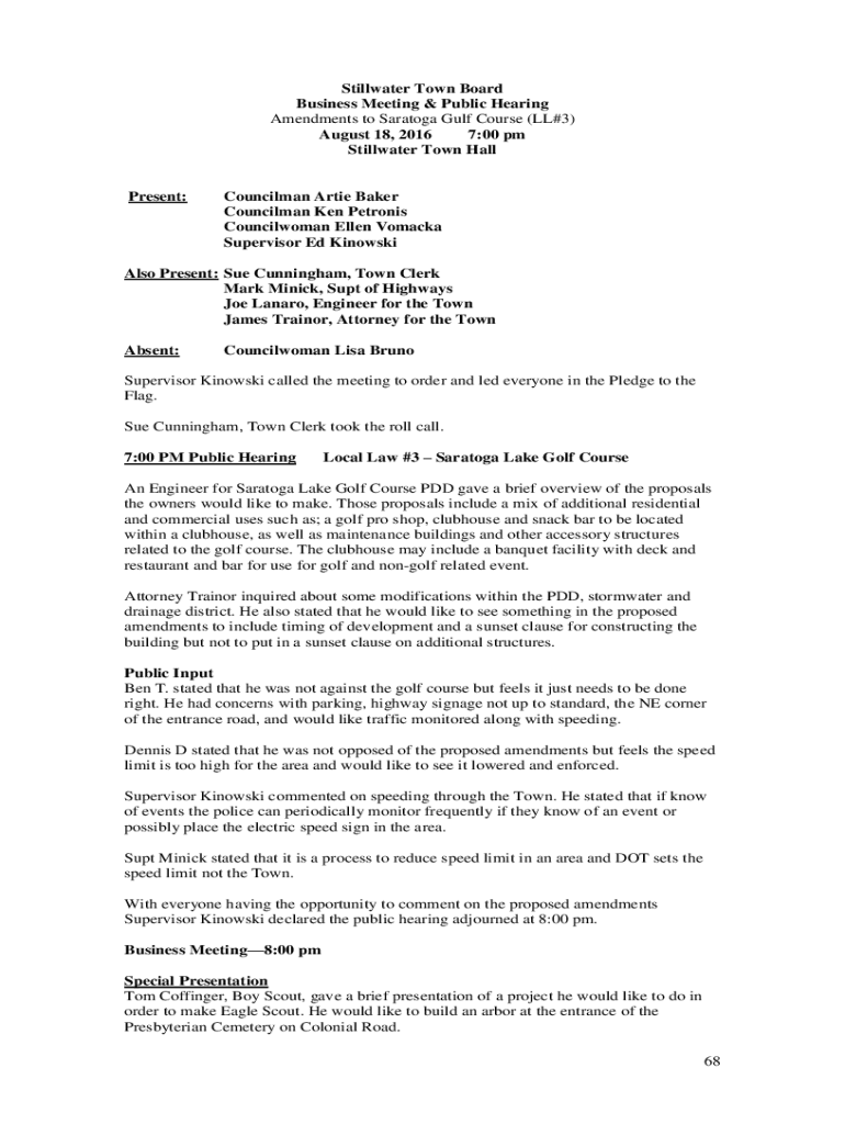 Stillwater Town Board Business Meeting & Public Hearing Amendments to Saratoga Gulf Course (LL#3) August 18, 2016 7:00 pm Stillwater Town Allurement:Councilman Artie Baker Councilman Ken Petronas