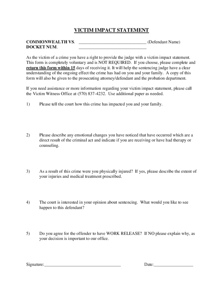 VICTIM IMPACT STATEMENT COMMONWEALTH VS. ___ (Defendant Name) DOCKET SUM. ___ As the victim of a crime you have a right to provide the judge with a victim impact statement. This form is completely