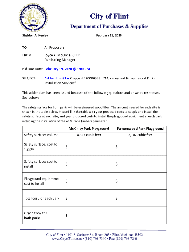 City of Flint Department of Purchases & Supplies Sheldon A. NeeleyFebruary 11, 2020TO:All ProposersFROM:Joyce A. McClure, PPB Purchasing Managed Due Date: February 19, 2020 @ 1:00 PM SUBJECT:Addendum