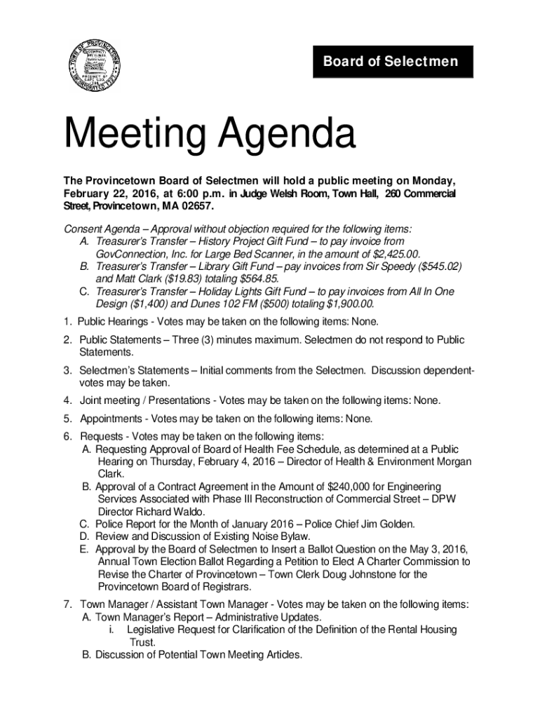 Board of SelectmenMeeting Agenda The Provincetown Board of Selectmen will hold a public meeting on Monday, February 22, 2016, at 6:00 p.m. in Judge Welsh Room, Town Hall, 260 Commercial Street, Provincetown,