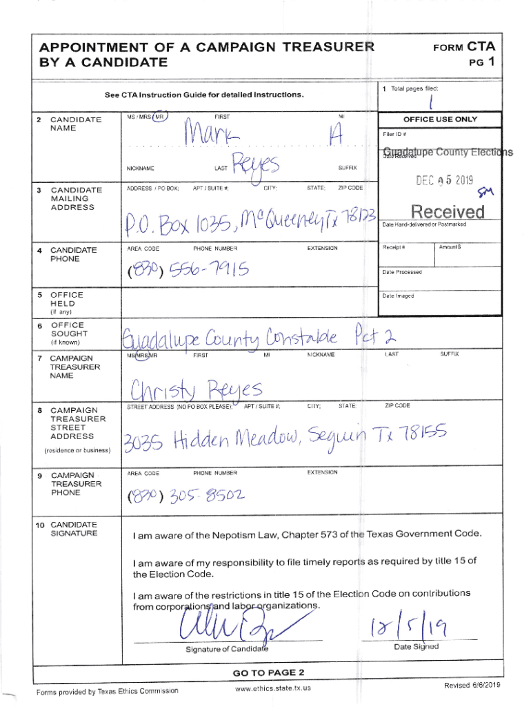 APPOINTMENT OF A CAMPAIGN TREASURER BY A CANDIDATEFORMPG1 1See CTA instruction Guide for detailed instructions. Total pages filed:I2 CANDIDATES / MRSMINAME3CANDIDATE MAILING ADDRESSADORESS/Poor;CANDIDATE