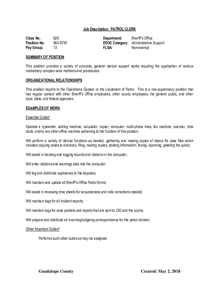 Get the free www.co.guadalupe.tx.ushrjobsJob Description: PATROL CLERK Class No. 629 Department: ...