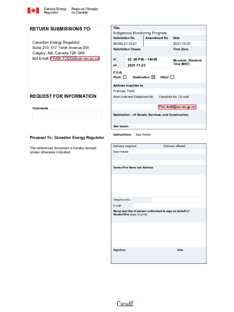 RETURN SUBMISSIONS TO:TitleIndigenous Monitoring Program Solicitation No. Canadian Energy Regulator Suite 210, 517 Tenth Avenue SW Calgary, AB, Canada T2R 0A8 Bid Email: FRAN.TODD@cerrec.gc.caAmendment