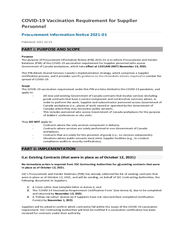 COVID-19 Vaccination Requirement for Supplier Personnel Procurement Information Notice 202101 Published: 20211019PART i: PURPOSE AND SCOPE Purpose The purpose of Procurement Information Notice (PIN)202101