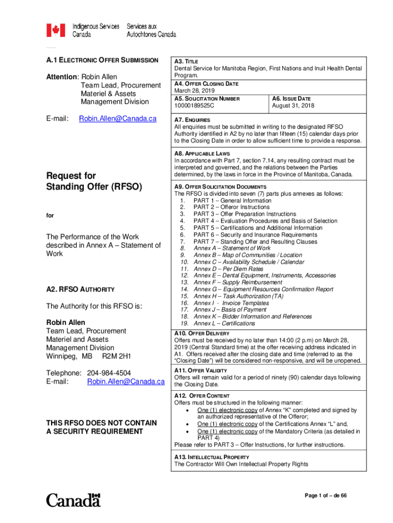 A.1 ELECTRONIC OFFER SUBMISSION Attention: Robin Allen Team Lead, Procurement Material & Assets Management Division Email:Robin.Allen@Canada.caRequest for Standing Offer (RFS) forth Performance of