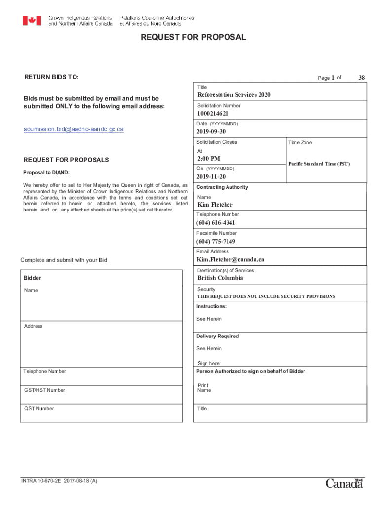 REQUEST FOR PROPOSALRETURN BIDS TO:Page1ofTitleBids must be submitted by email and must be submitted ONLY to the following email address: soumission.bid@aadncaandc.gc.caReforestation Services 2020