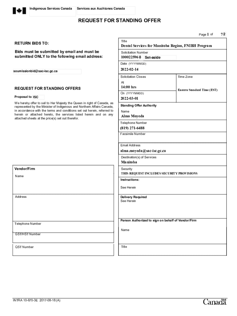 Indigenous Services CanadaServices aux Auctioned CanadaREQUEST FOR STANDING OFFER