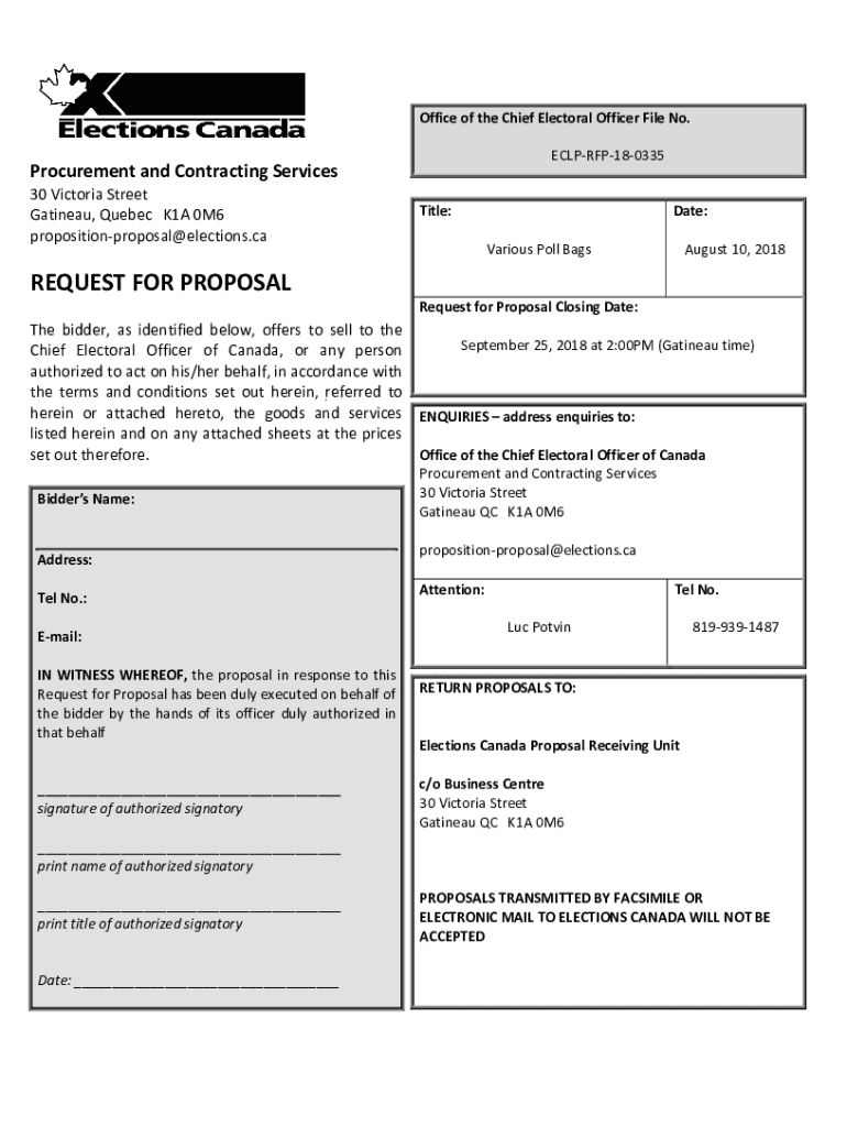Office of the Chief Electoral Officer File No. ECLPRFP180335Procurement and Contracting Services 30 Victoria Street Gatineau, Quebec K1A 0M6 propositionproposal@elections.caTitle:Date: Various Poll