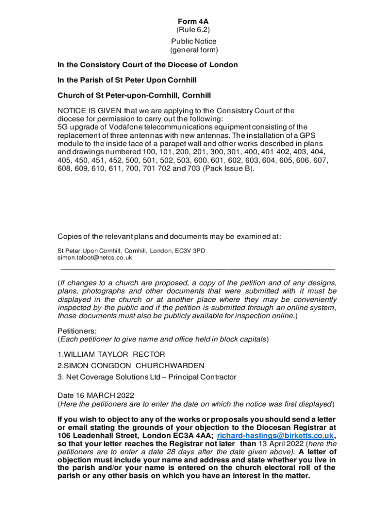 Form 4A (Rule 6.2) Public Notice (general form) In the Consistory Court of the Diocese of London In the Parish of St Peter Upon Corn hill Church of St PeteruponCornhill, Corn hill NOTICE IS GIVEN