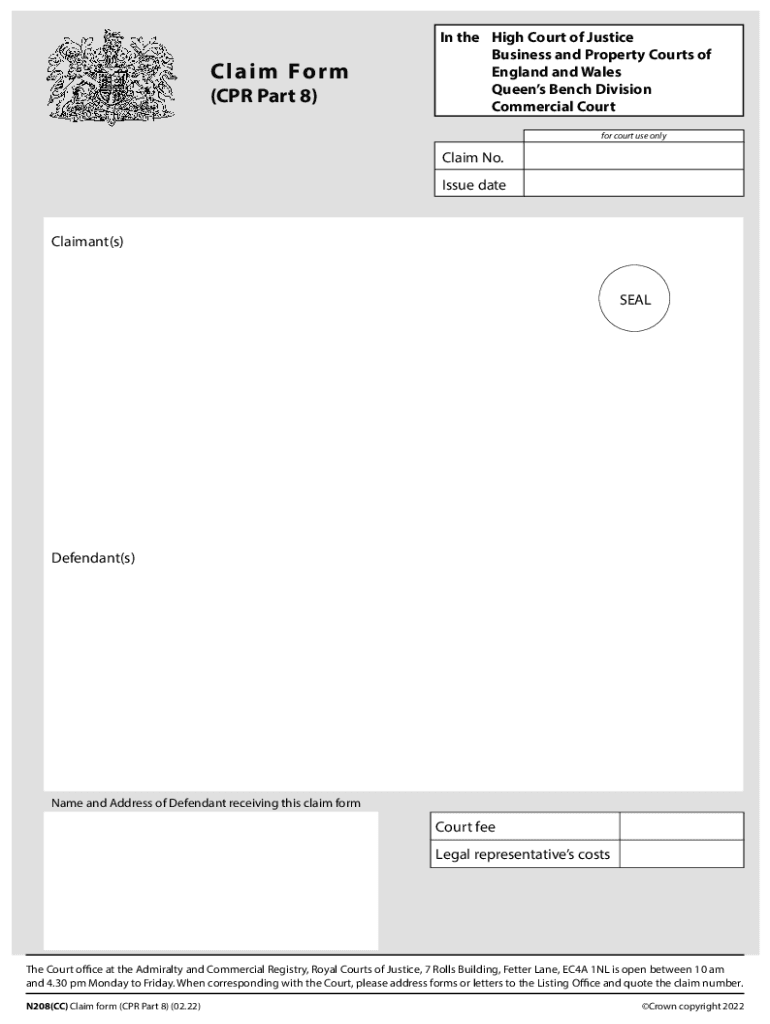 Cl an i m F o rm (CPR Part 8)In thigh Court of JusticeBusiness and Property Courts of England and Wales Queen's Bench Division Commercial Court for court use onlyClaim No. Issue dateClaimant(s)SEALDefendant(s)Name