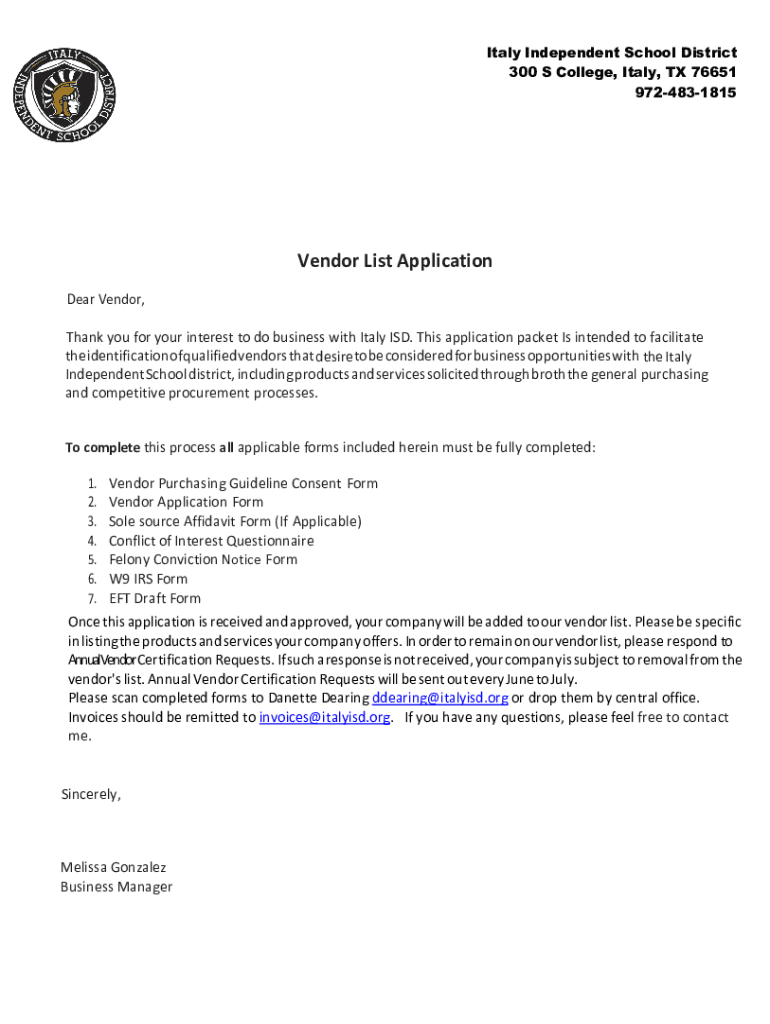 Italy Independent School District 300 S College, Italy, TX 76651 9724831815Vendor List Application Dear Vendor, Thank you for your interest to do business with Italy ISD. This application packet Is