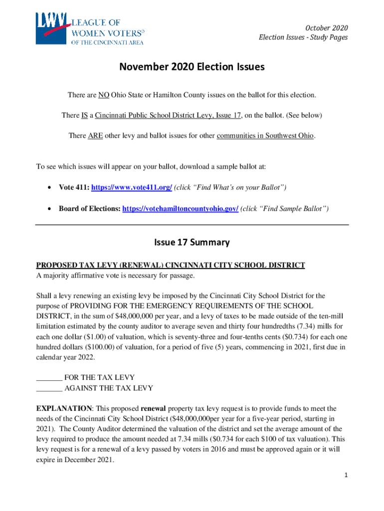 October 2020 Election Issues Study Pages November 2020 Election Issues There are NO Ohio State or Hamilton County issues on the ballot for this election. There IS a Cincinnati Public School District