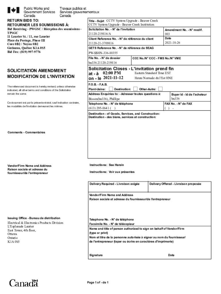 11RETURN BIDS TO: RETURNER LES COMMISSIONS :Title Suet CCTV System Upgrade Beaver Creek CCTV System Upgrade Beaver Creek Institution Receiving PW GSC / Reception DES sou missions TP SGC 11 Laurie