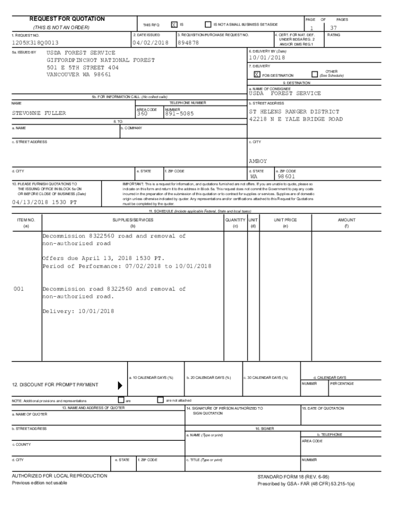 REQUEST FOR QUOTATIONXTHIS RFQ(THIS IS NOT AN ORDER)PAGE ISIS NOT A SMALL BUSINESS SET ASIDE1. REQUEST NO.2. DATE ISSUED3. REQUISITION/PURCHASE REQUEST NO.1205K318Q001304/02/20188948785a. ISSUED BYOFPAGES3714.