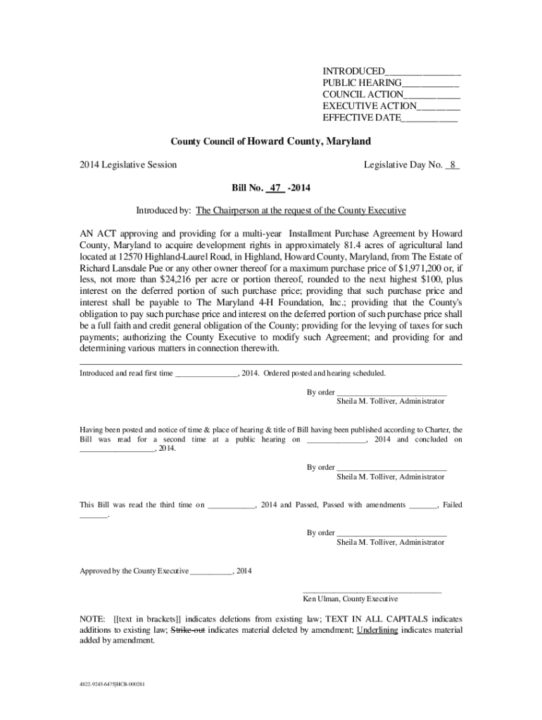INTRODUCED___ PUBLIC HEARING___ COUNCIL ACTION___ EXECUTIVE ACTION___ EFFECTIVE DATE___ County Council of Howard County, Maryland 2014 Legislative SessionLegislative Day No. 8. Bill No. 47 2014Introduced