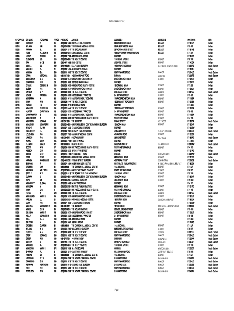 Northern Ireland GP List GP CYPHER E0007 E0018 E0022 E0025 E0035 E0038 E0042 E0043 E0050 E0053 E0059 E0069 E0075 E0082 E0083 E0094 E0097 E0112 E0114 E0125 E0126 E0142 E0148 E0168 E0181 E0186 E0189