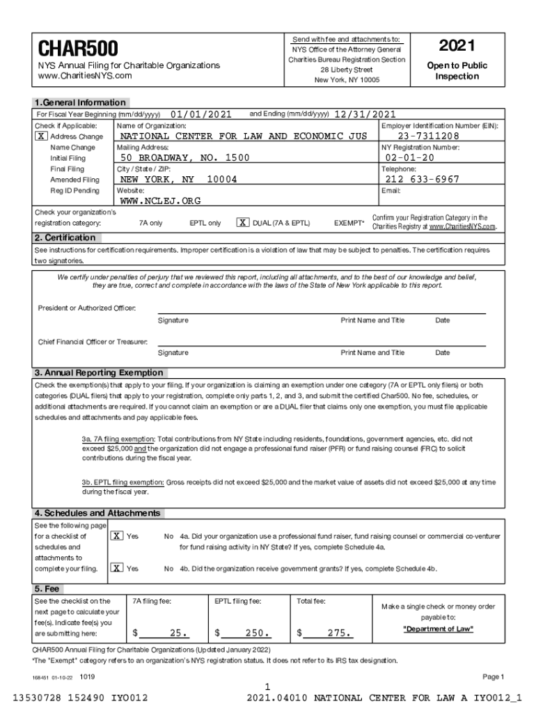 CHAR500Send with fee and attachments to: NYS Office of the Attorney General Charities Bureau Registration Section 28 Liberty Street New York, NY 10005NYS Annual Filing for Charitable Organizations