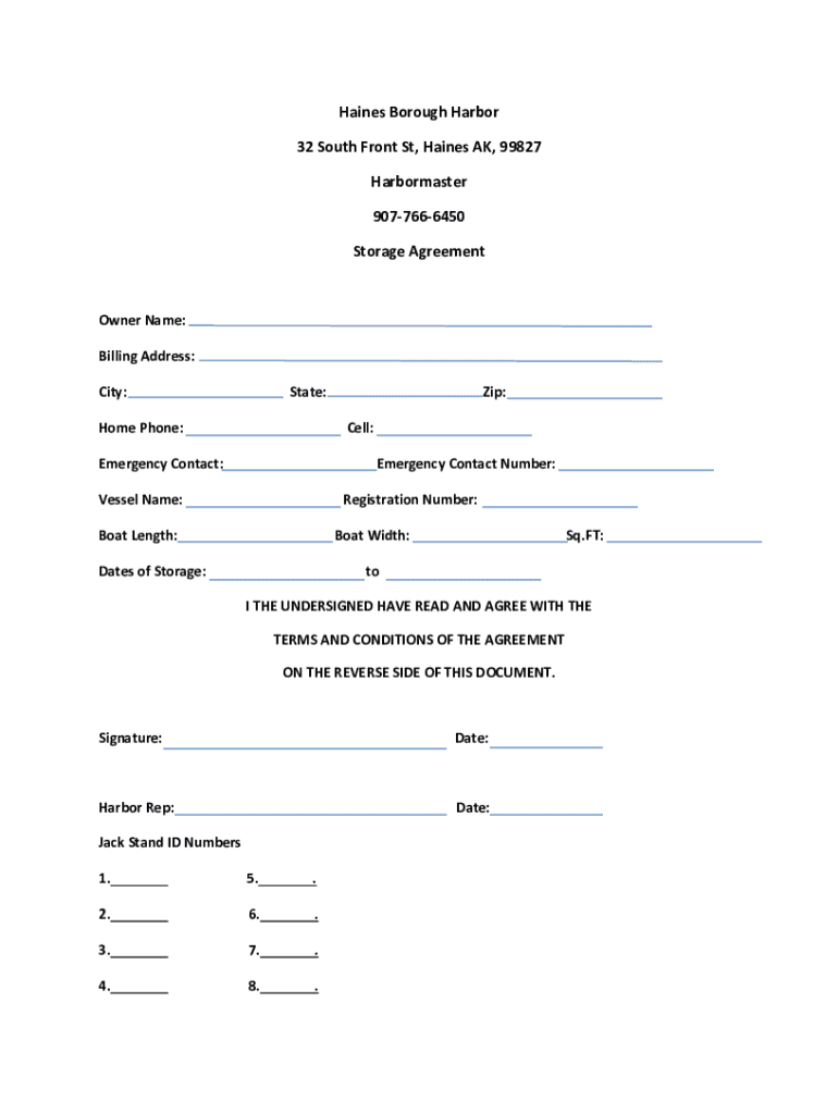 Haines Borough Harbor 32 South Front St, Haines AK, 99827 Harbormaster 9077666450 Storage AgreementOwner Name: Billing Address: City:State:Home Phone:Zip: Cell:Emergency Contact:Emergency Contact