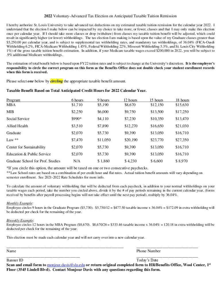 2022 VoluntaryAdvanced Tax Election on Anticipated Taxable Tuition Remission I hereby authorize St. Louis University to take advanced tax deductions on my estimated taxable tuition remission for the