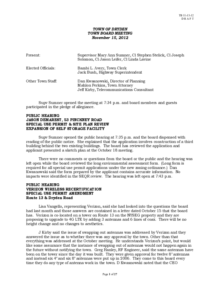 November 15, 2012Present:Supervisor Mary Ann Sumner, Cl Stephen Ste lick, Cl Joseph