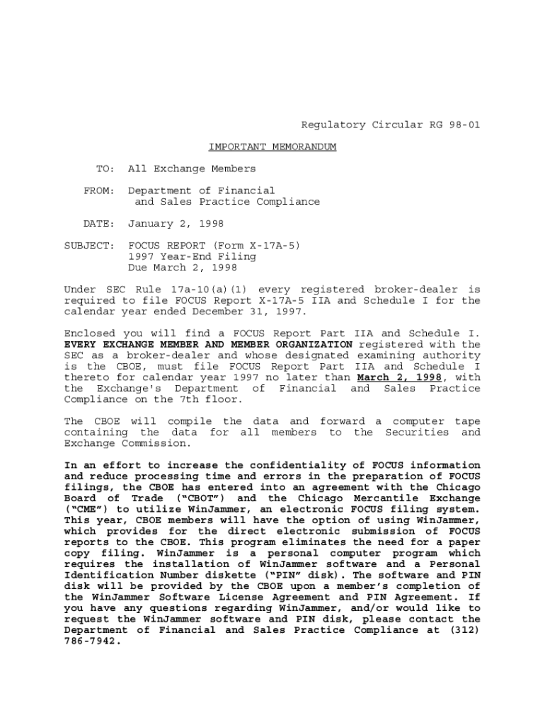 Regulatory Circular KG 9801 IMPORTANT MEMORANDUM TO:All Exchange MembersFROM:Department of Financial and Sales Practice ComplianceDATE:January 2, 1998SUBJECT:FOCUS REPORT (Form X17A5) 1997 YearEnd
