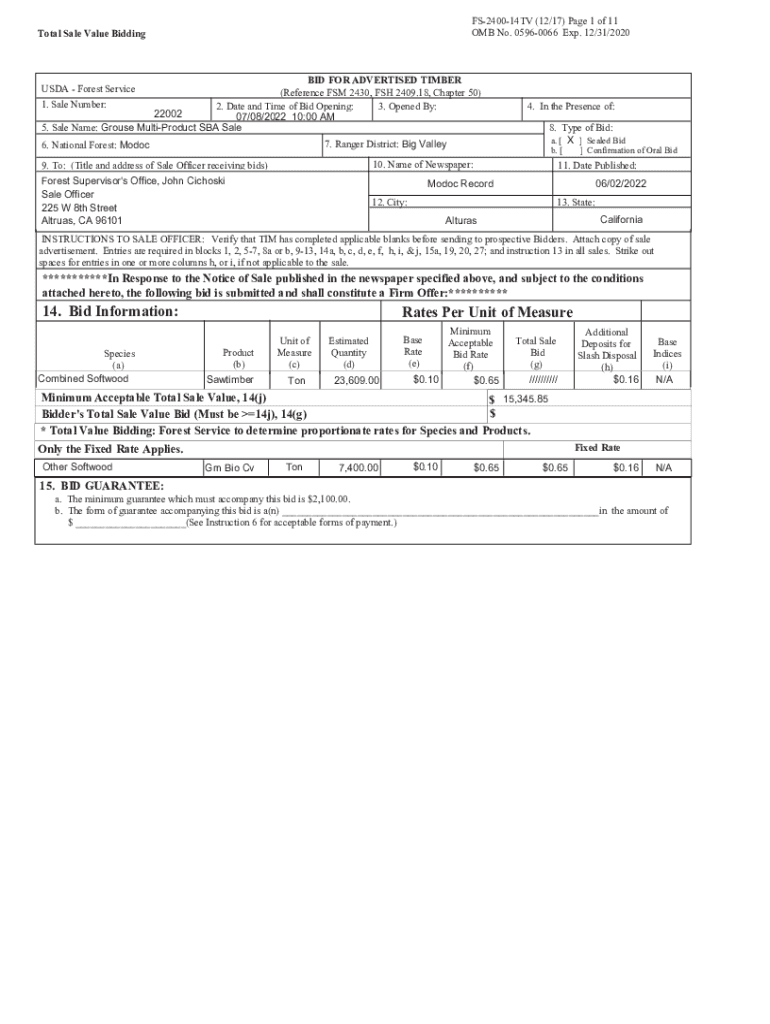 FS240014TV (12/17) Page 1 of 11 OMB No. 05960066 Exp. 12/31/2020Total Sale Value Bidding BID FOR ADVERTISED TIMBER (Reference FSM 2430, FSH 2409.18, Chapter 50) 1. Sale Number: 2. Date and Time of