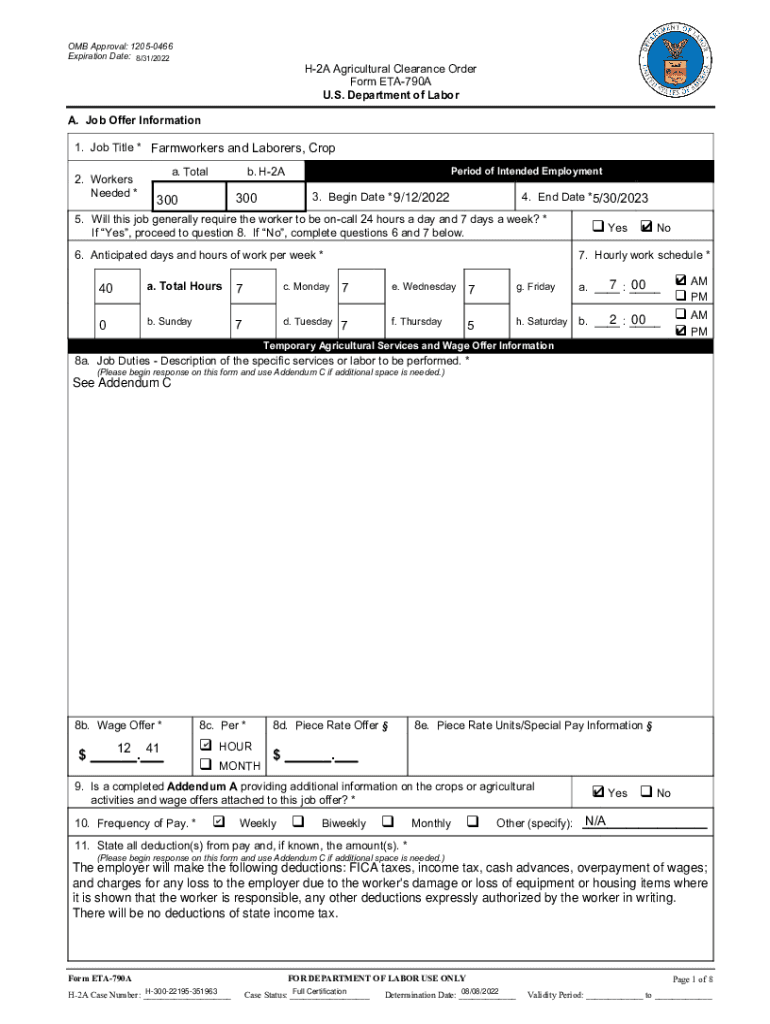OMB Approval: 12050466 Expiration Date: 8/31/2022H2A Agricultural Clearance Order Form ETA790A U.S. Department of Labor. Job Offer Information 1. Job Title * Farmworkers and Laborers, Crop 2. Workers