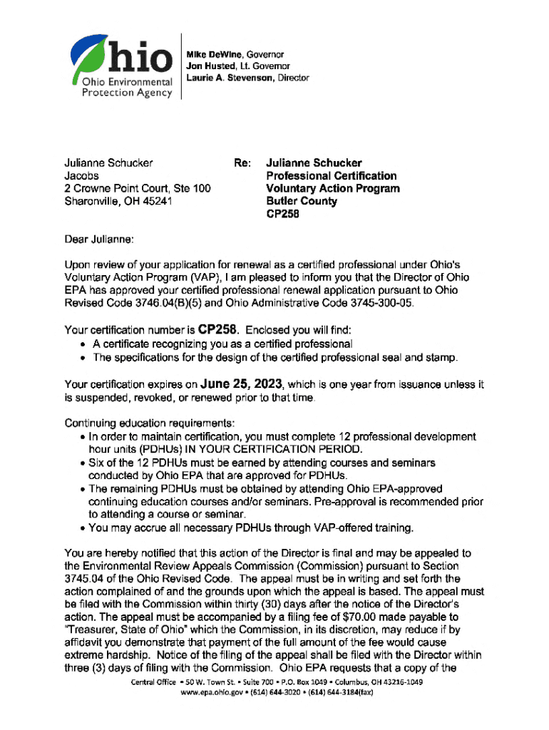 Mike DeWine, Governor Jon Hosted, Lt. Governor Laurie A. Stevenson, Director Julianne Checker Jacobs 2 Crown Point Court, Ste 100 Sharpeville, OH 45241Re:Julianne Checker Professional Certification