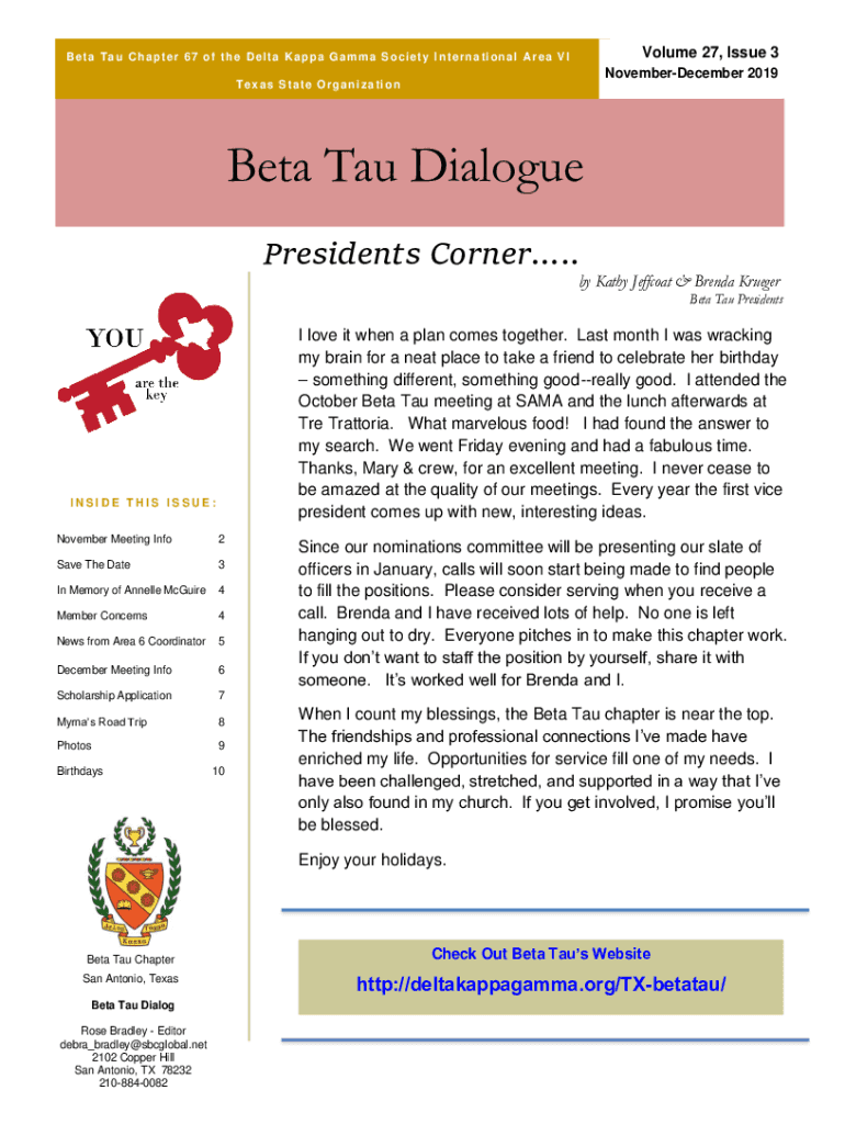 Volume 27, Issue 3B e t a T an u C h a p t e r 6 7 o f t h e D e l t a K a p p a G an m an S o c i e t y I n t e r n a t i o n an l Ar e a V INovemberDecember 2019Texas State OrganizationBeta Tau