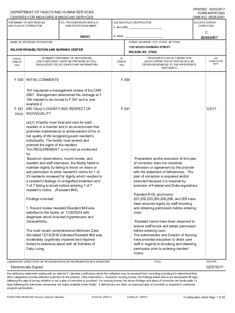 AND PLAN OF CORRECTION(X1) PROVIDER/SUPPLIER/CIA