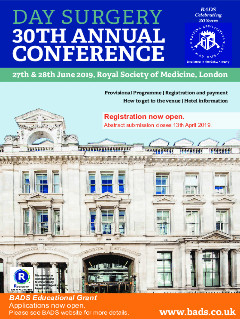 DAY SURGERY 2018 BAD 30TH ANNUAL 2018 BAD CONFERENCEBADSCelebrating 30 Years D VA N C E N O T I C EASMASM21& Royal 22 June 2018 of Medicine, Sheffield City Hall 27th & 28th June 2019, Society London