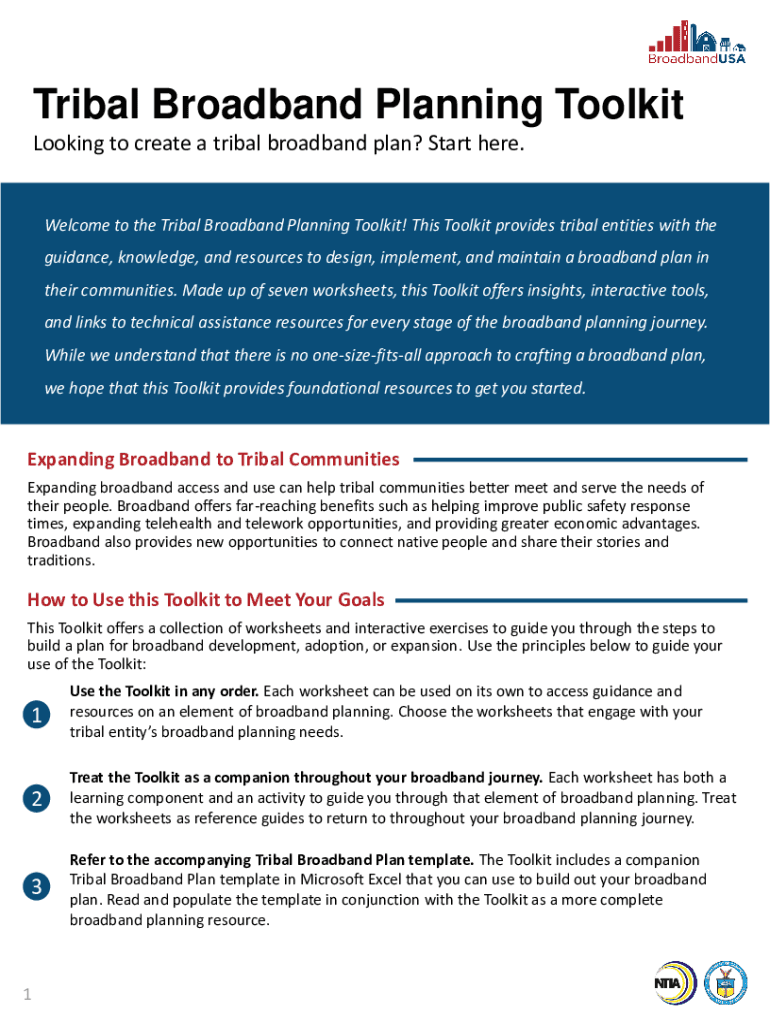 Tribal Broadband Planning Toolkit Looking to create a tribal broadband plan? Start here. Welcome to the Tribal Broadband Planning Toolkit! This Toolkit provides tribal entities with the guidance,