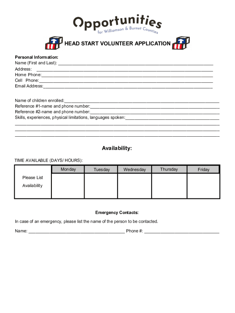 HEAD START VOLUNTEER APPLICATION Personal Information: Name (First and Last): ___ Address: ___ Home Phone:___ Cell Phone:___ Email Address:___ Name of children enrolled:___ Reference #1name and phone