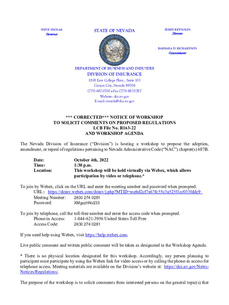 STEVE SISOLAKGovernorSTATE OF NEVADATERRY REYNOLDSDirectorBARBARA D. RICHARDSONCommissionerDEPARTMENT OF BUSINESS AND INDUSTRYDIVISION OF INSURANCE