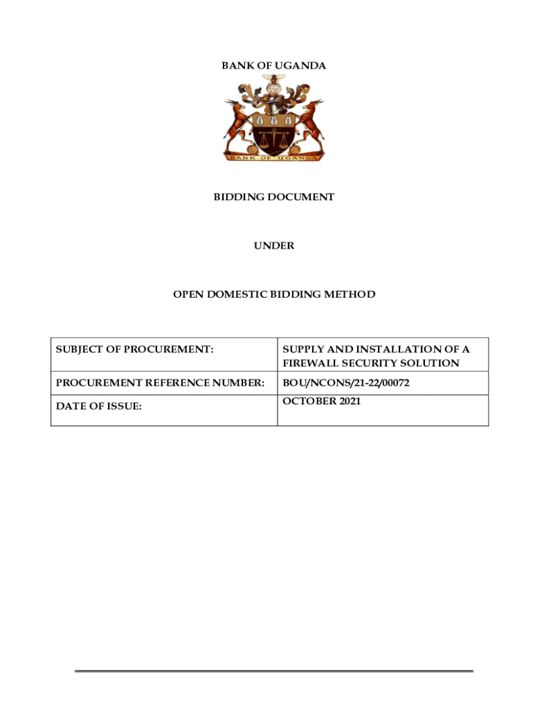 BANK OF UGANDABIDDING DOCUMENTUNDEROPEN DOMESTIC BIDDING METHODSUBJECT OF PROCUREMENT:SUPPLY AND INSTALLATION OF A FIREWALL SECURITY SOLUTIONPROCUREMENT REFERENCE NUMBER:BOU/ICONS/2122/00072DATE OF