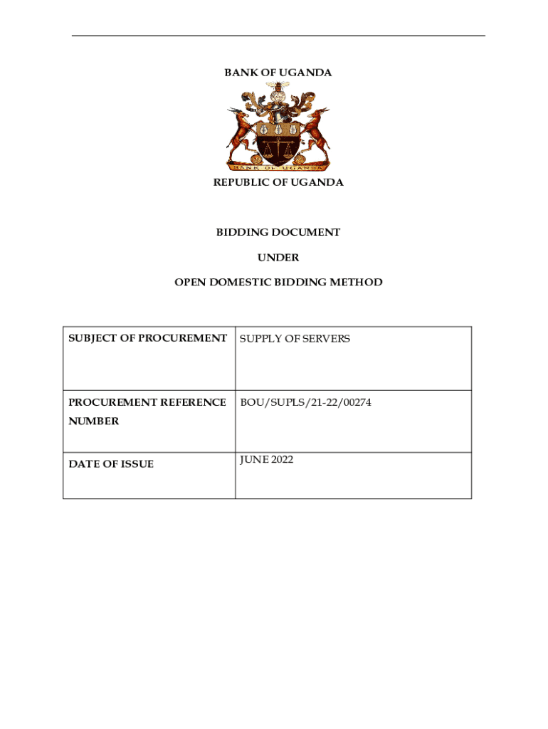 BANK OF UGANDAREPUBLIC OF UGANDABIDDING DOCUMENT UNDER OPEN DOMESTIC BIDDING METHODSUBJECT OF PROCUREMENTSUPPLY OF SERVERSPROCUREMENT REFERENCE BOU/SUPS/2122/00274NUMBERDATE OF ISSUEJUNE 2022Part