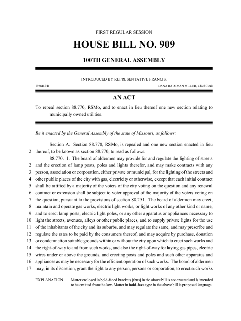 FIRST REGULAR SESSIONHOUSE BILL NO. 909 100TH GENERAL ASSEMBLY INTRODUCED BY REPRESENTATIVE FRANCIS. 1958H.01IDANA BASEMAN MILLER, Chief Clerk AN ACT To repeal section 88.770, RSM, and to enact in