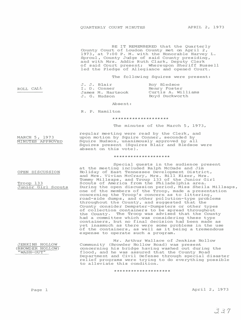 AP OIL 2, 19 7 3QUARTERLY COU RT M MINUTES IT REMEMBERED that the Quarter l y County Court o f London County met on Apr i l 2, 19 7 3, a t 7 : 0 0 P. M. Wit h the Honor ab l e Harvey L. Sprout l,