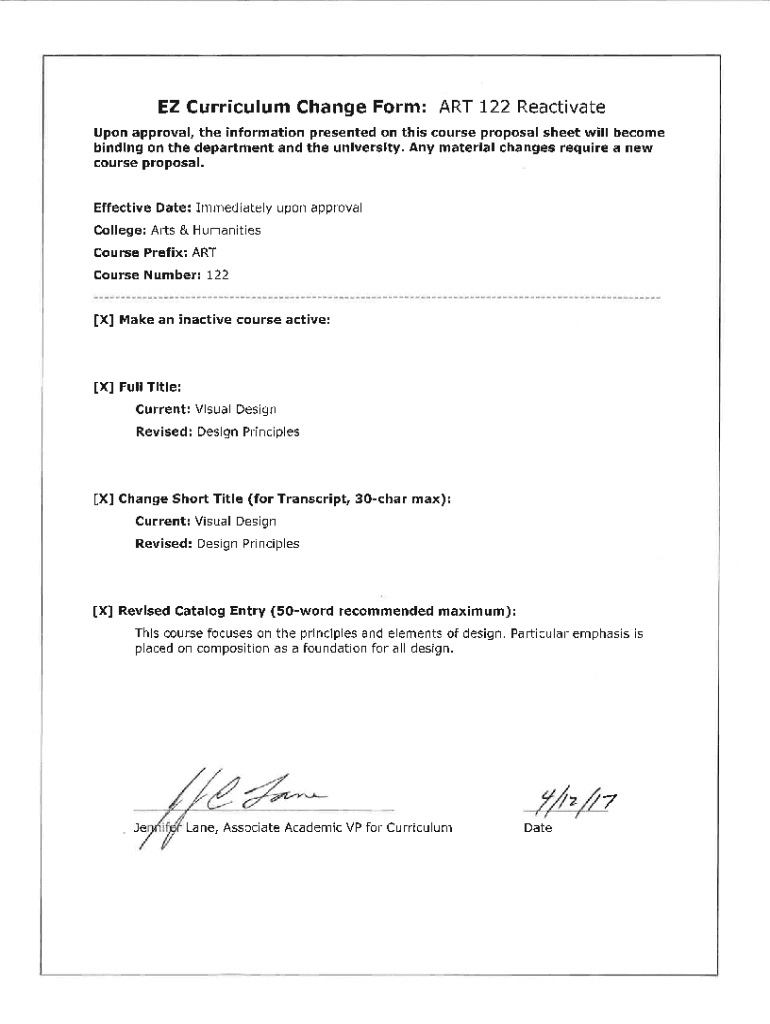 Curriculum Change Form: Names, Numbers, Descriptions, Prerequisites, Active/Inactive, Course Fees Upon approval, the information presented on this course proposal sheet will become binding on the