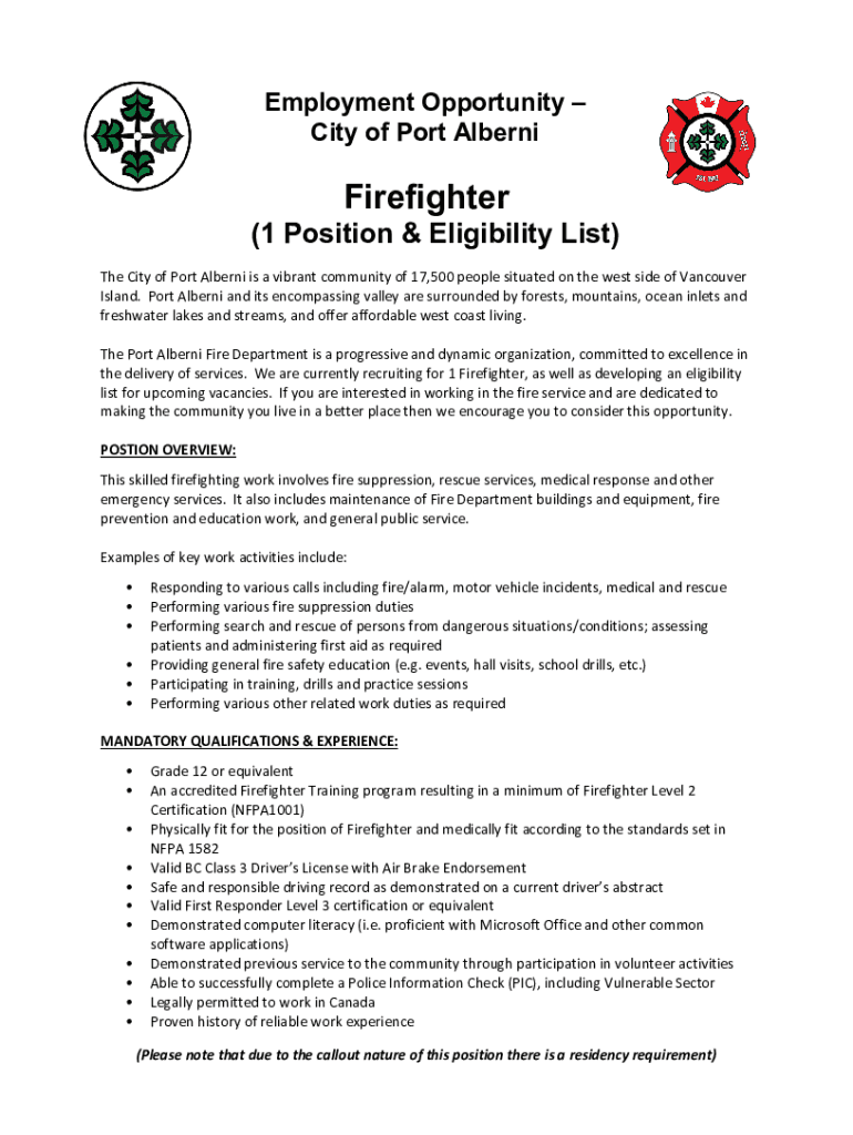 Employment Opportunity City of Port AlberniFirefighter(1 Position & Eligibility List) The City of Port Albert is a vibrant community of 17,500 people situated on the west side of Vancouver Island.