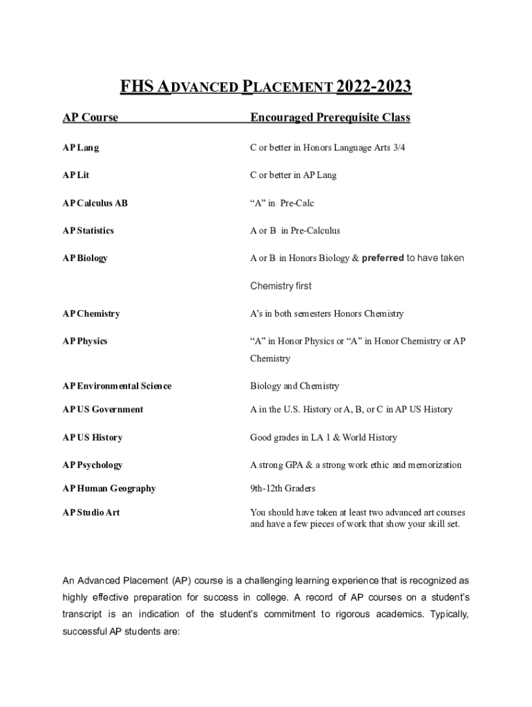 FHS A ADVANCED PLACEMENT 20222023 AP CourseEncouraged Prerequisite Class AP Lang or better in Honors Language Arts 3/4AP ITC or better in AP Lang AP Calculus ABA in Precancel Statistics or B in PreCalculus
