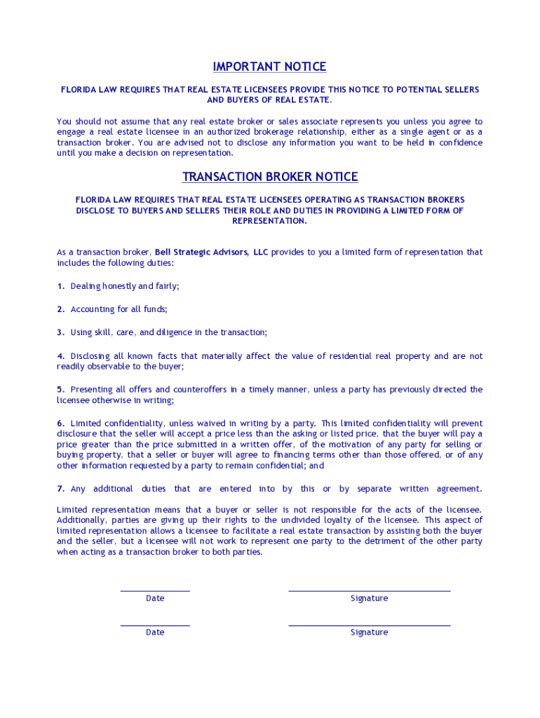 IMPORTANT NOTICE FLORIDA LAW REQUIRES THAT REAL ESTATE LICENSEES PROVIDE THIS NOTICE TO POTENTIAL SELLERS AND BUYERS OF REAL ESTATE. You should not assume that any real estate broker or sales associate