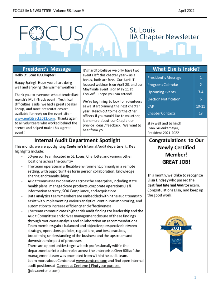 FOCUS IIA NEWSLETTER Volume 58, Issue 9 April 2022 ___Presidents MessageHello St. Louis IIA Chapter! Happy Spring! Hope you all are doing well and enjoying the warmer weather! Thank you to everyone