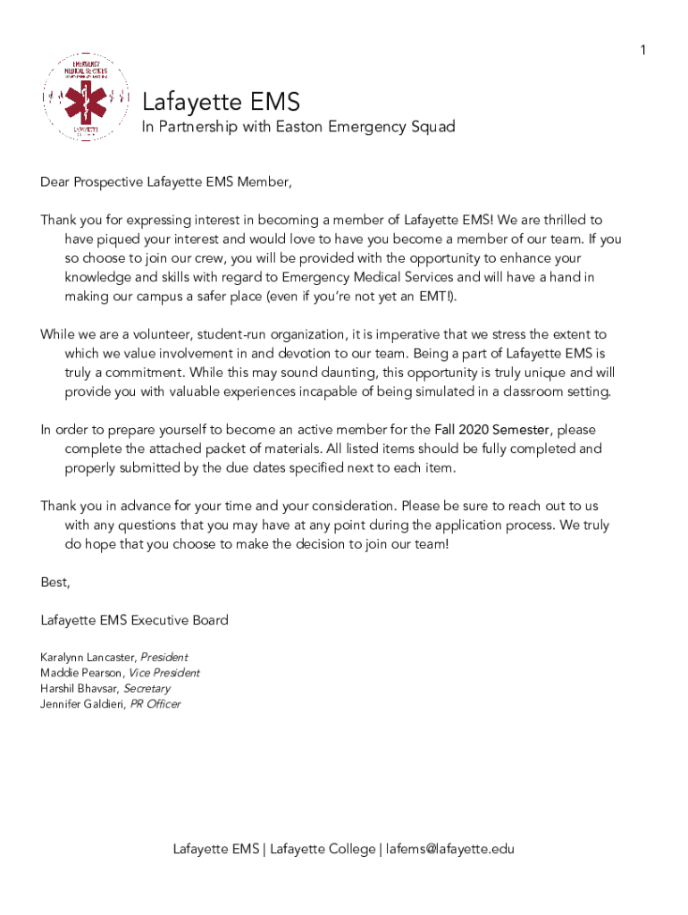 1 Lafayette MSIN Partnership with Easton Emergency Squad Dear Prospective Lafayette EMS Member, Thank you for expressing interest in becoming a member of Lafayette EMS! We are thrilled to have piqued