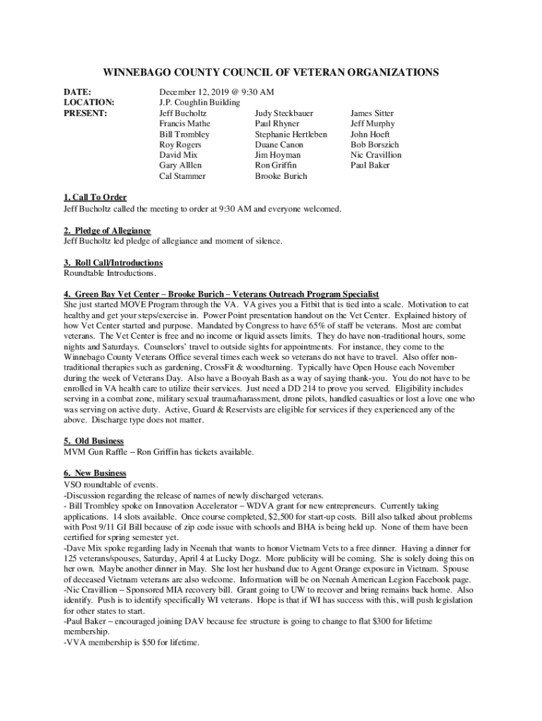 WINNEBAGO COUNTY COUNCIL OF VETERAN ORGANIZATIONS DATE: LOCATION: PRESENT:December 12, 2019 @ 9:30 AM J.P. Coughlin Building Jeff Schultz Judy Steckbauer Francis Mate Paul Rhymer Bill Trembley Stephanie