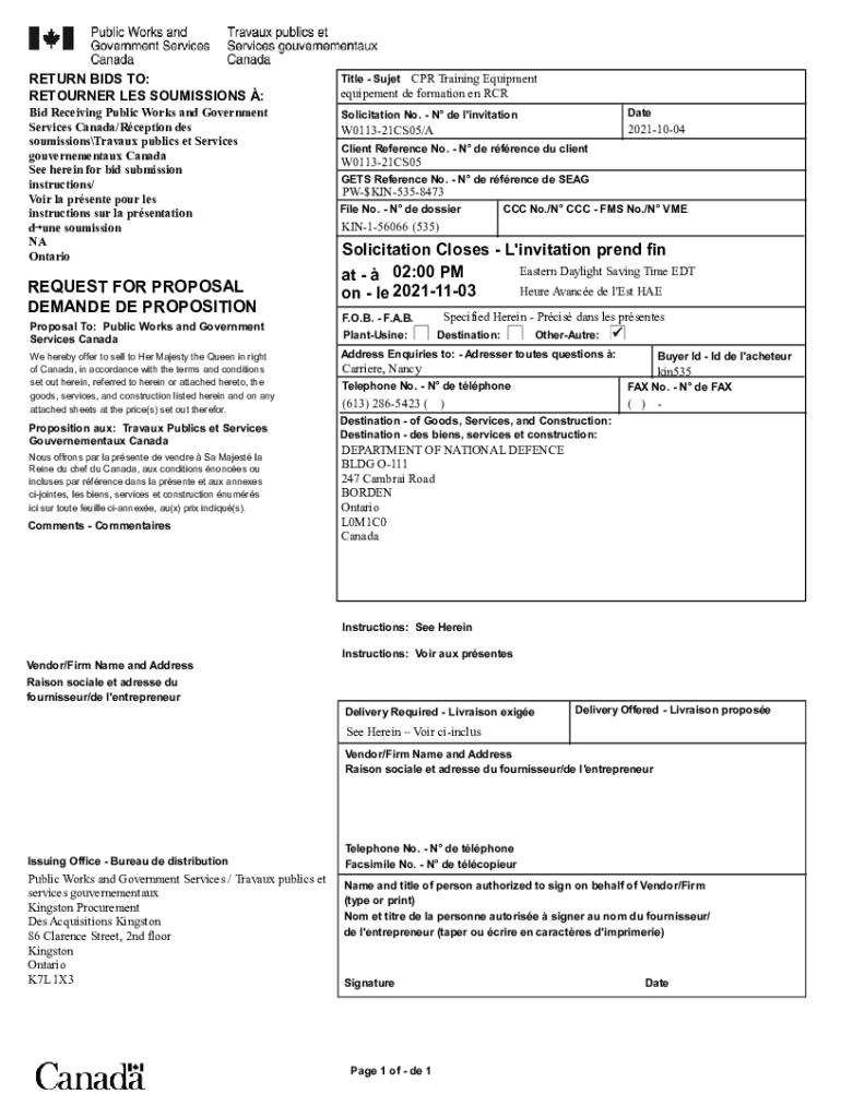 1 1RETURN BIDS TO: RETURNER LES COMMISSIONS :Title Suet CPR Training Equipment Receiving Public Works and Government Services Canada/Reception DES soumissionsTravaux public set Services gouvernementaux