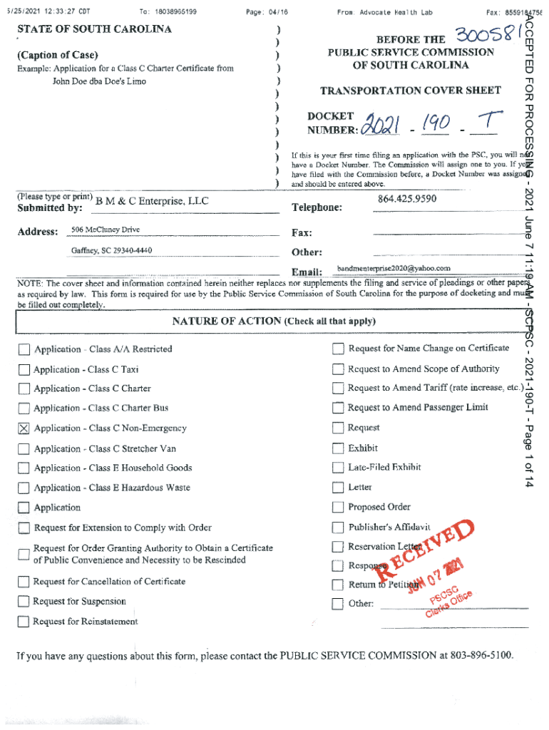 To: 18038965199CDTPage: 04/16From; Advocate Health Lactate OF SOUTH CAROLINA(Caption of Case))Example: Application for a Class C Charter Certificate from John Doe DBA Doe\'s Limo))))BEFORE THE PUBLIC
