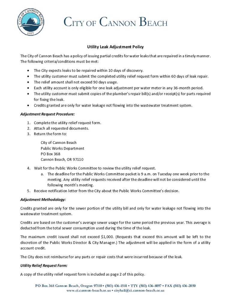 Get the free Utility Leak Adjustment Policy - City of Cannon Beach