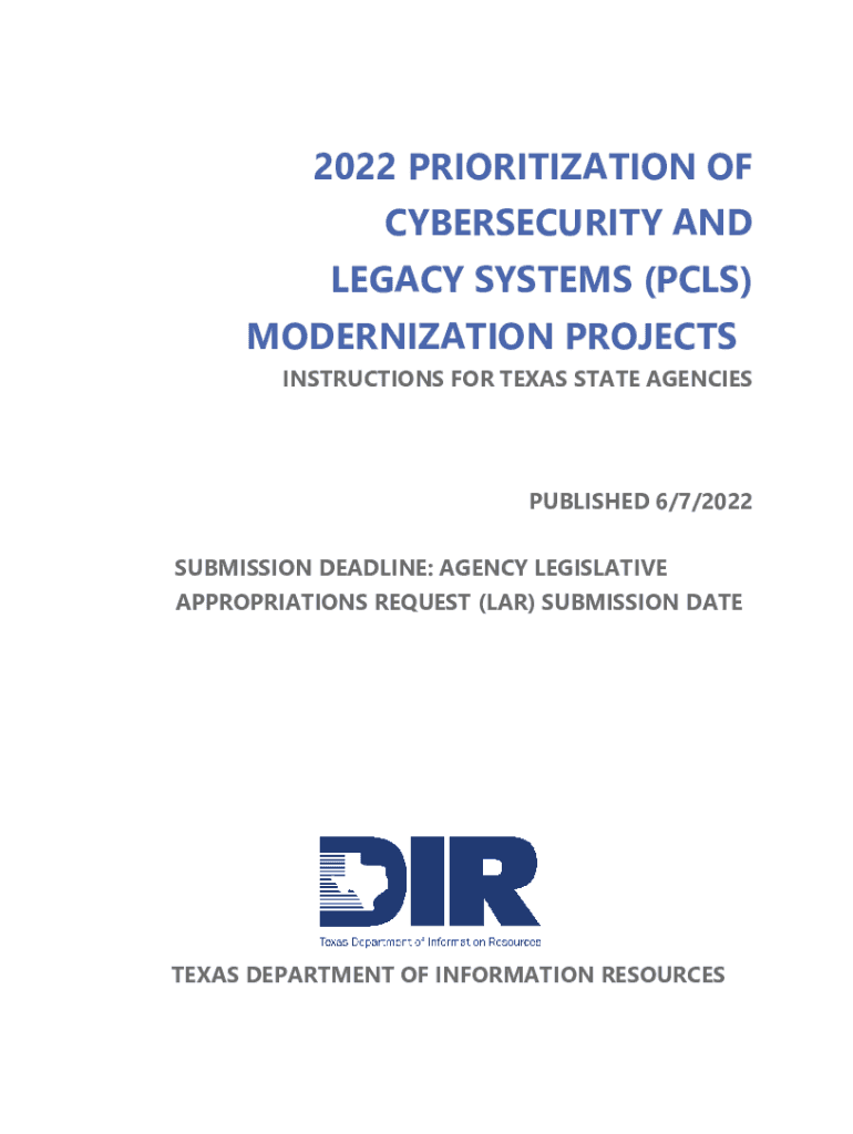 2022 PRIORITIZATION OF CYBERSECURITY AND LEGACY SYSTEMS (PCs) MODERNIZATION PROJECTS INSTRUCTIONS FOR TEXAS STATE AGENCIESPUBLISHED 6/7/2022 SUBMISSION DEADLINE: AGENCY LEGISLATIVE APPROPRIATIONS
